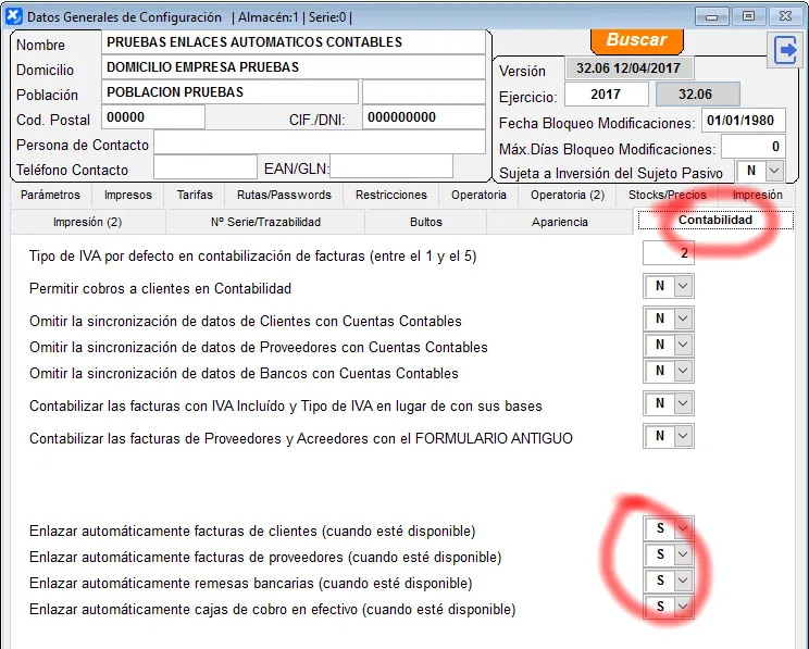 Si no se desea que el enlace de facturas de clientes, facturas de proveedores y remesas de cobros a bancos se efectúe de forma automática al generarse el documento y prefiere seguir haciendo los enlaces de forma manual como hasta ahora, puede configurarlo desactivando las opciones correspondientes en Gestión / Archivos / Datos Generales / Pestaña Contabilidad: