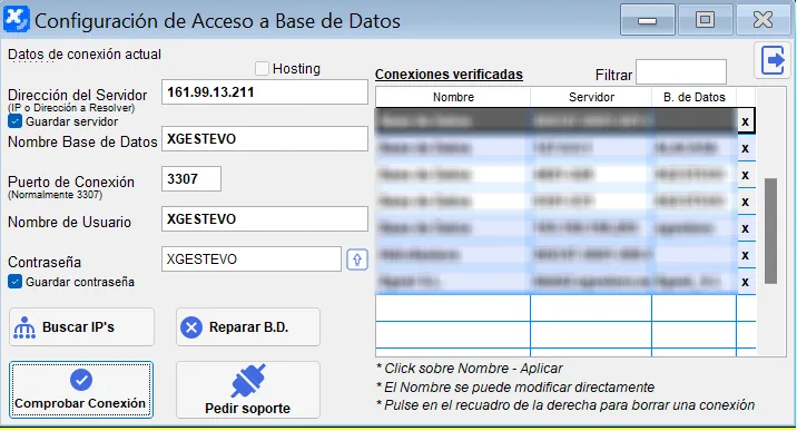 Para conectar desde un ordenador externo, debemos acceder al formulario de configuración de acceso a la base de datos de XgestEvo y ahí configurar la IP externa y el puerto de nuestro servidor.
