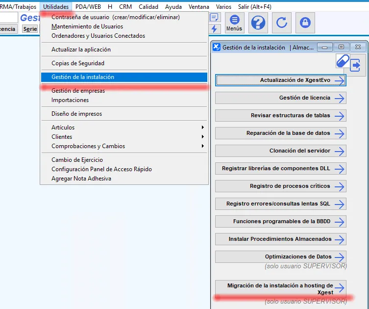Utilidades -> Gestión de la Instalación -> Migración de la instalación a hosting de Xgest: