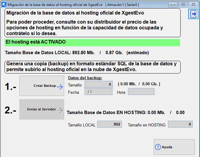Pulsaremos la opción “Enviar al Servidor” y nos abrirá otra pantalla del sistema para enviar la copia de seguridad que acabamos de crear a la base de datos en la nube del hosting de XgestEvo.