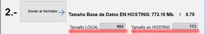 En este caso nos indica que el hosting está activado, que la base de datos local tiene un tamaño de 0.87 gigabytes (en este ejemplo, podríamos contratar la opción básica de 1 Gb.).