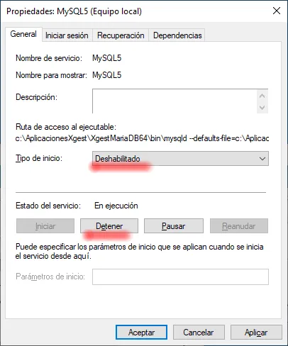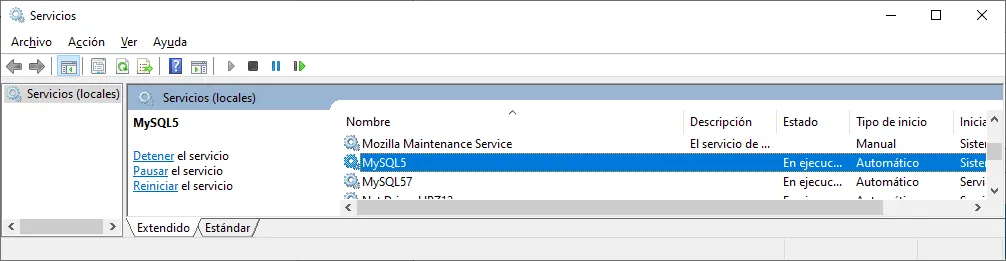 Para desactivar el servidor local, podemos acceder a la pantalla de configuración de Servicios de Windows, localizamos el servicio MySQL5.