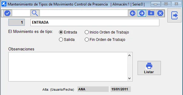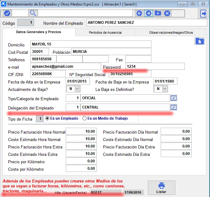 Aquí podemos crear y/o modificar las fichas de los empleados de la empresa, que son los que podrán acceder mediante el Control de Presencia.