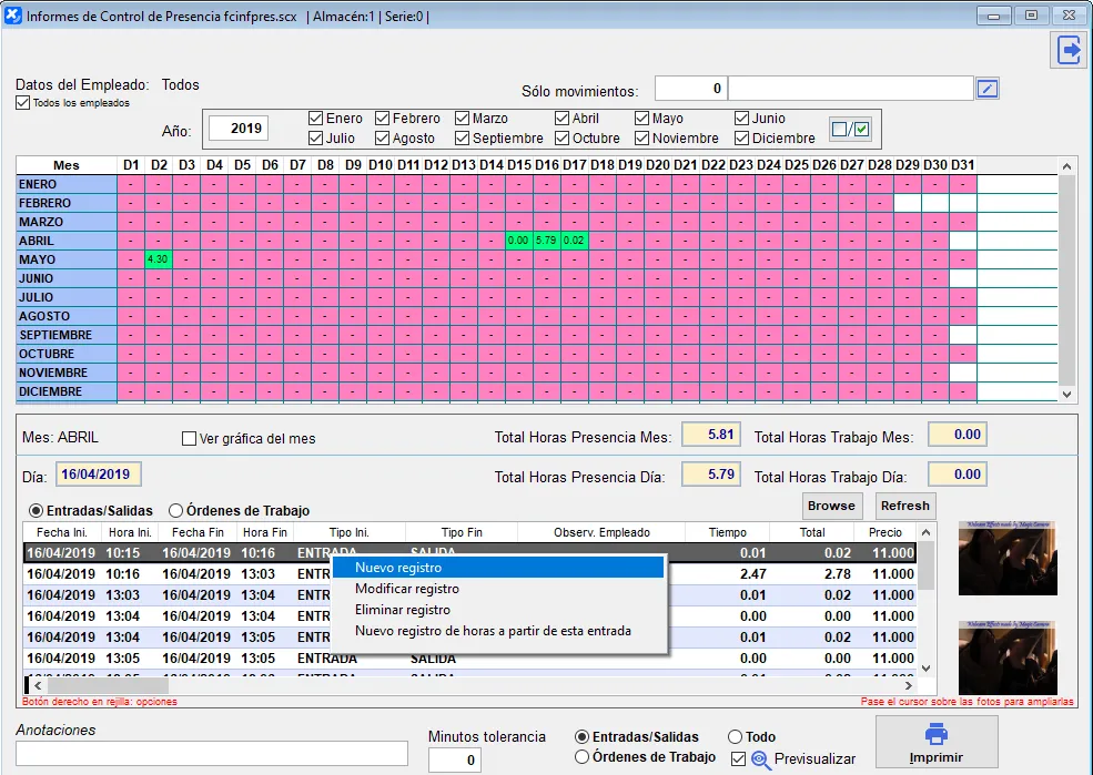 También muestra a la derecha las fotos de entrada y salida del registro seleccionado. Si pasamos el cursor por encima de ellas nos muestra una ampliación en el centro de la pantalla.