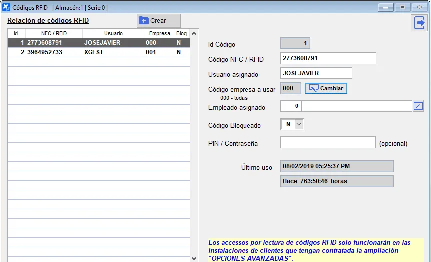 Los accesos por lectura de códigos RFID solo funcionarán en las instalaciones de clientes que tengan contratada la ampliación “OPCIONES AVANZADAS” u otra opción que se implemente en el futuro para este objeto.