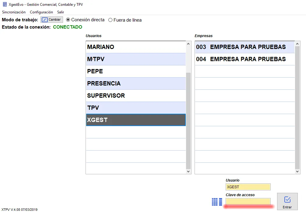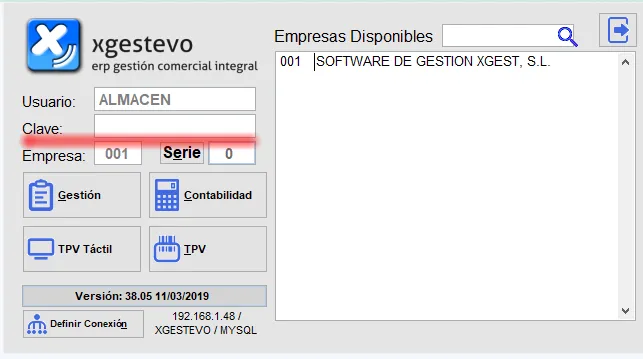 La pantalla de conexión de XgestEvo: