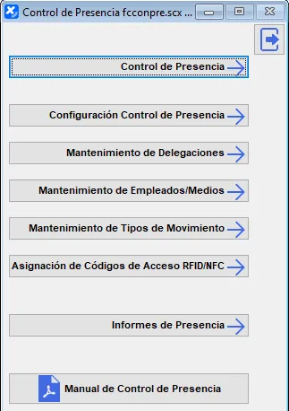 La primera opción, Control de Presencia, pone en marcha la pantalla para que los empleados se identifiquen con el control de presencia, aunque lo normal es tener un usuario (por ejemplo llamado PRESENCIA) que al arrancar Xgest abrirá directamente esta pantalla y no dejará salir de la misma si no se sabe la contraseña para cerrarlo.