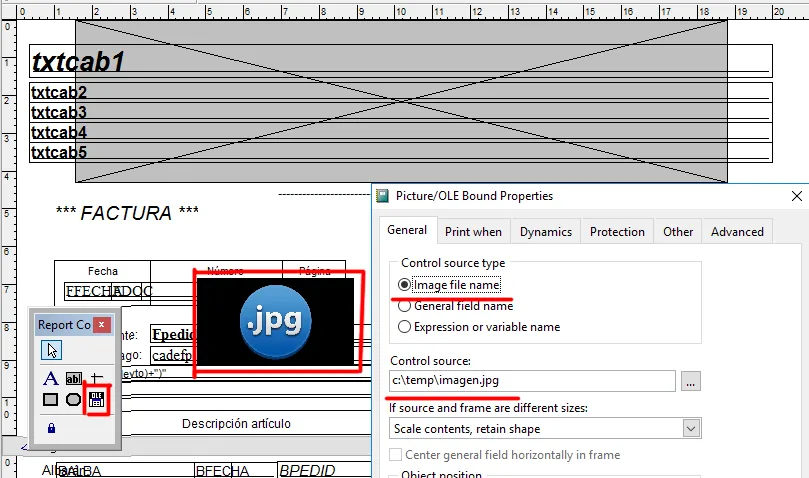 En el Diseño de Impresos insertamos un Control de Imágen (marcado como OLE) y lo configuramos como se indica en el ejemplo adjunto -