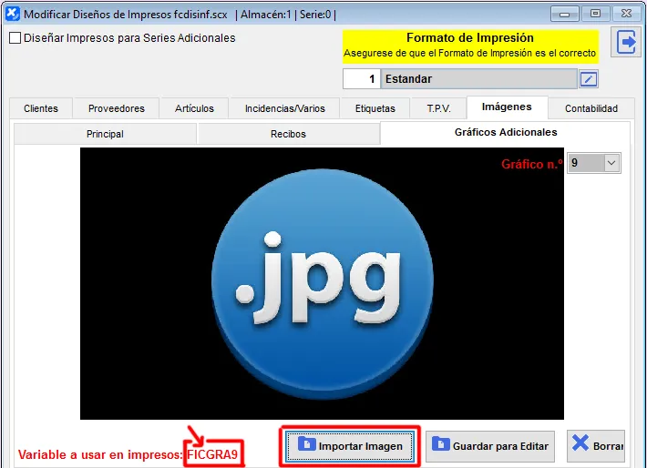 2- cerrar y guardar el diseño, en la pantalla de diseño de impresos dirigirse a la pestaña imágenes→gráficos adicionales. Elegir un gráfico que no esté en uso e importar la misma imagen que hemos usado en el diseño del documento: