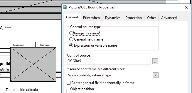 3- editar nuevamente el diseño, dando doble click en la imagen tendremos que cambiar la opción seleccionada ‘image file name’ por ‘expression or variable name’ y en ‘control source’ colocar el texto de la variable indicada anteriormente. El recuadro de la imagen quedará en gris y ya podemos cerrar el diseño:
