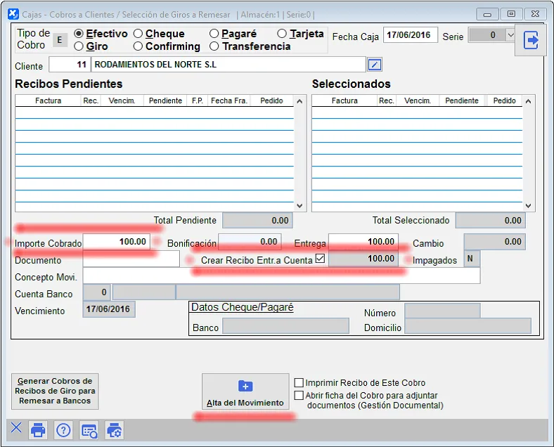 En la casilla Importe Cobrado ponemos el importe del cobro.