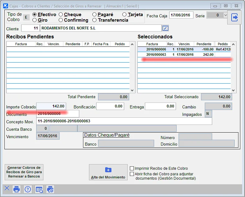 Al seleccionar los recibos, en Importe Cobrado indica 142.00 euros, que es la diferencia entre la factura y la entrega a cuenta.