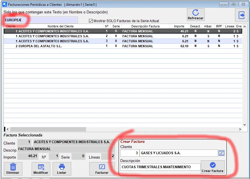 Para crear una nueva factura, en la parte inferior izquierda, en el recuadro “Crear Factura” introduciremos el código del cliente (podemos buscarlo por nombre si nos posicionamos en el mismo) y la descripción de la factura (por ejemplo, “CUOTAS DE SOPORTE MENSUAL”). Cuando lo tengamos, pulsando el botón “Crear Factura” creará una factura periódica con dichos datos y la abrirá para que introduzcamos el detalle, periodicidad y demás datos de la misma.