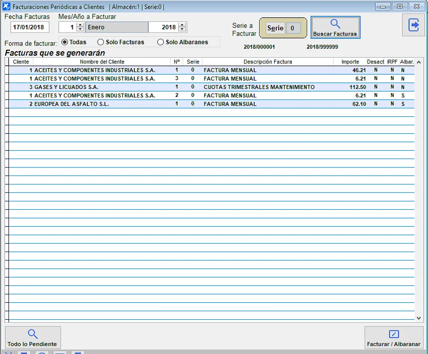 Seleccionando en Forma de Facturar, podemos procesar todas, solo las que van a generar facturas o solo las que generarán albaranes sin facturar.