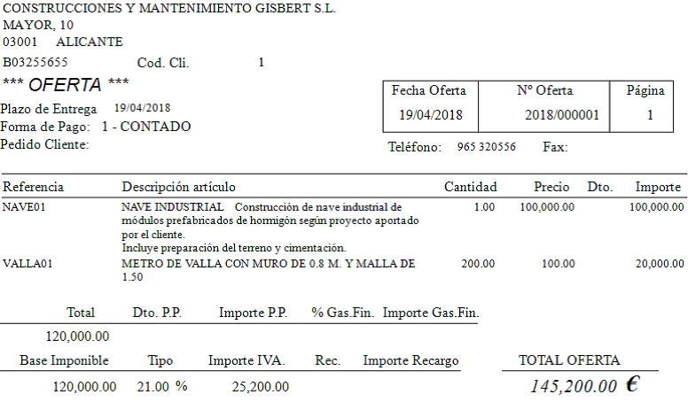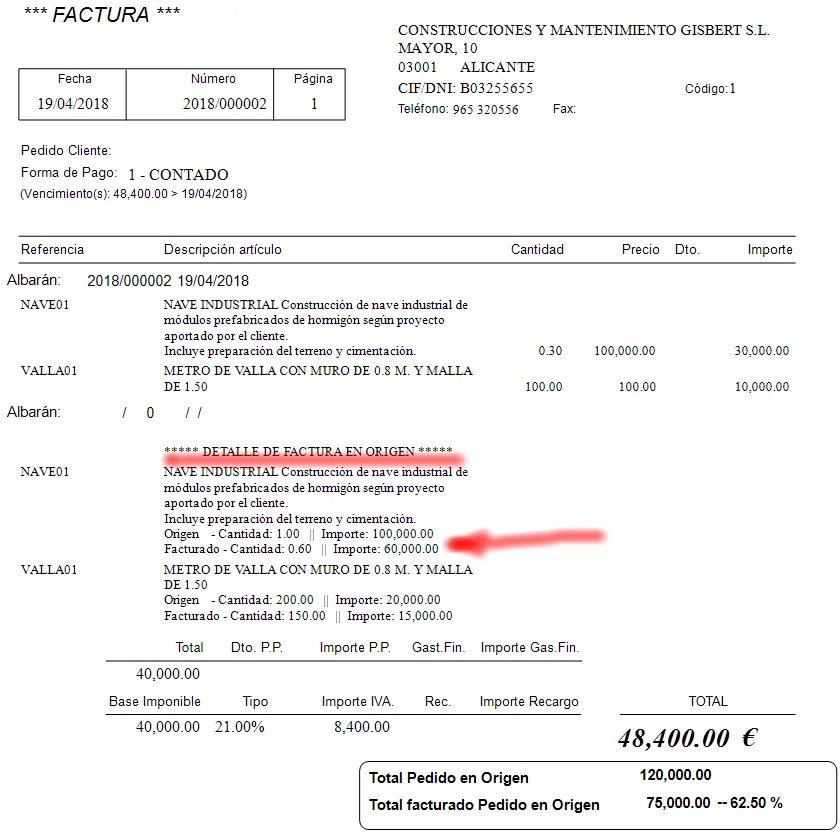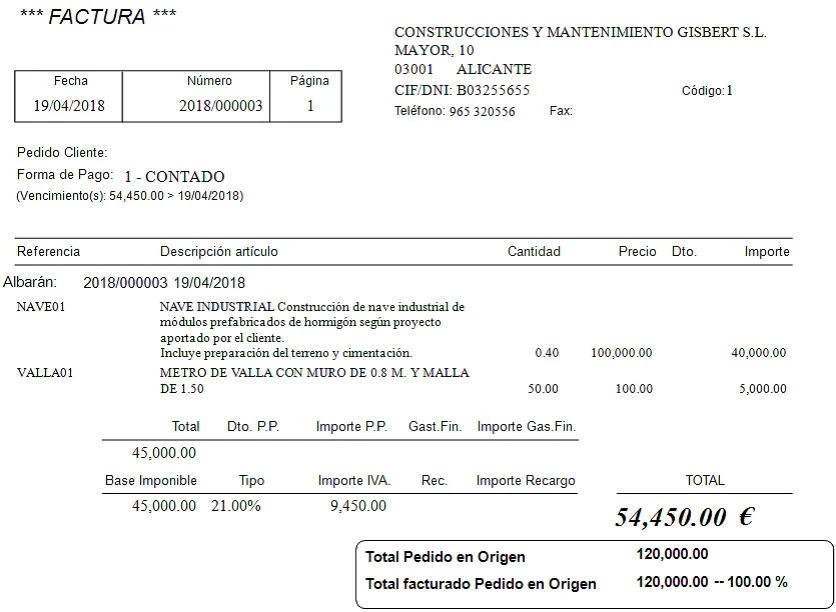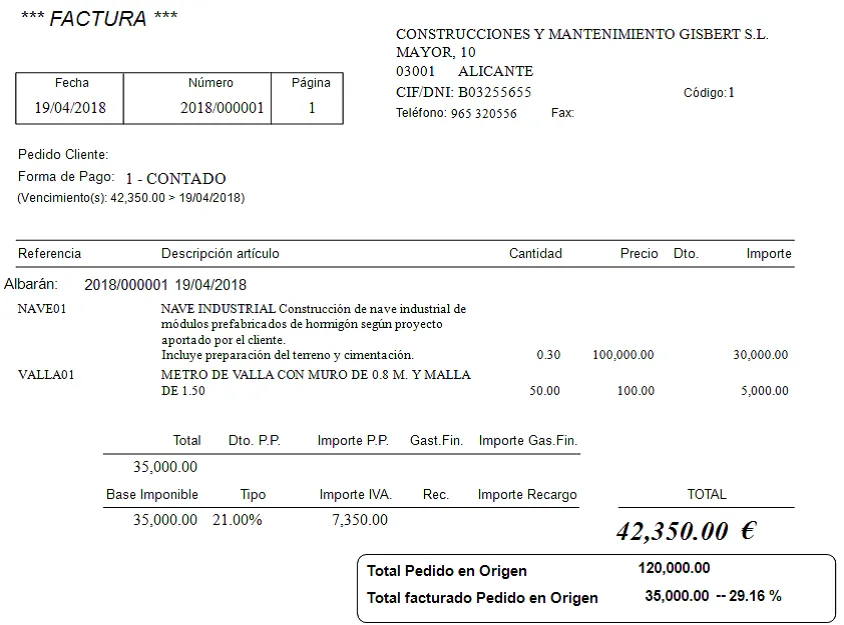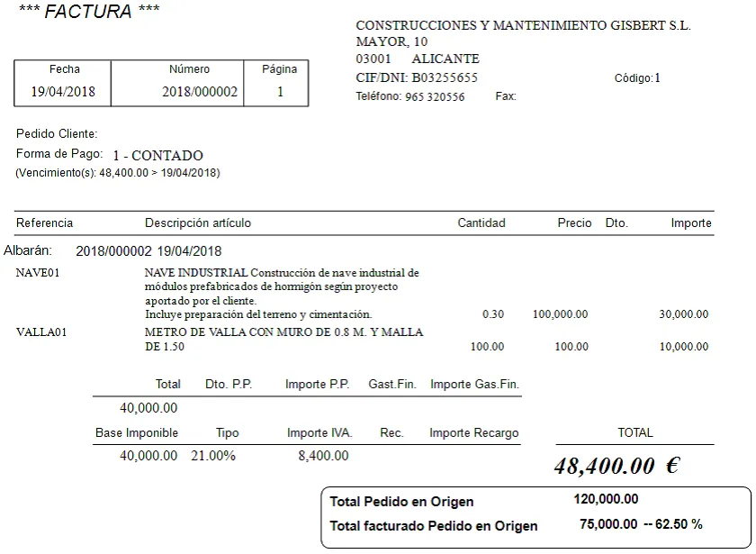 Ahora servimos un segundo albarán por otro 30% del importe de la nave y otros 100 metros de valla. Lo facturamos y tendríamos esto: