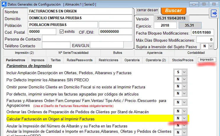 Al no ser un sistema de trabajo habitual, para que la aplicación haga los cálculos de facturación en origen para que estén disponibles a la hora de imprimir las facturas, hay que configurarlo en Datos Generales.