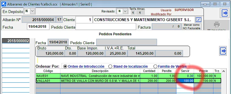 Ahora tenemos que hacer la primera de las facturas, que corresponde al 30% de la nave y 50 metros de valla. Para ello creamos un albarán, y pulsando el botón “Servir Pedidos” seleccionamos el pedido pendiente y en la columna Servir introducimos 0,30 unidades de la nave y 100 unidades de la valla: