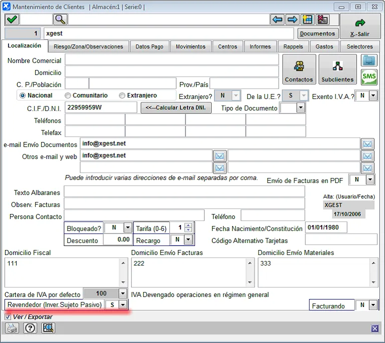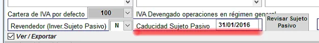 Dicha condición DEBE SER RENOVADA CADA AÑO, por lo cual se ha añadido en dicho mantenimiento de clientes la fecha de caducidad a la derecha del indicador de cliente de sujeto pasivo: