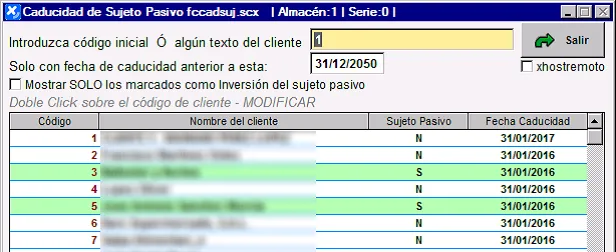 Cuando intentemos hacer una operación en un cliente en este estado, normalmente NOS DARÁ UN AVISO para que podamos ir a la ficha y, o bien quitar la marca como sujeto pasivo del cliente, o bien ampliar su caducidad.