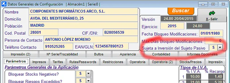 Si nuestra empresa está sujeta a la Inversión del Sujeto Pasivo, para que ello se tenga en cuenta en nuestros documentos de proveedores (artículos normales mezclados con artículos sujetos a la Inversión del Sujeto Pasivo), debemos especificarlo en Datos Generales: