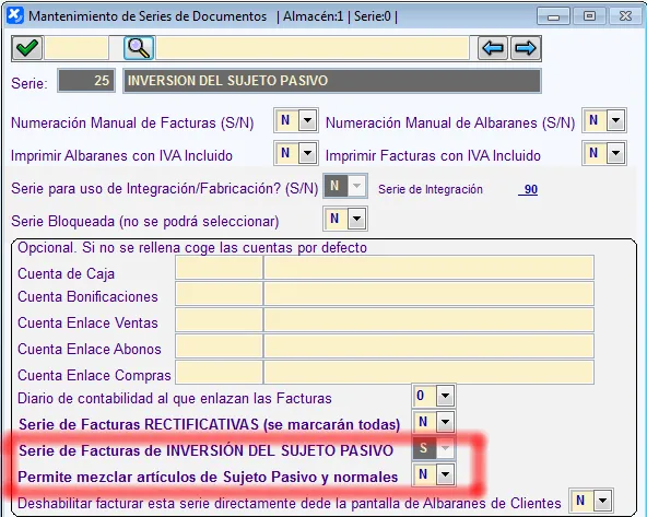 Existe ya una serie que se crea automáticamente llamada “INVERSIÓN DEL SUJETO PASIVO”, que se marca como tal y no se puede cambiar. Normalmente será la serie 25, y si esta está ocupada la inmediata posterior que haya libre.