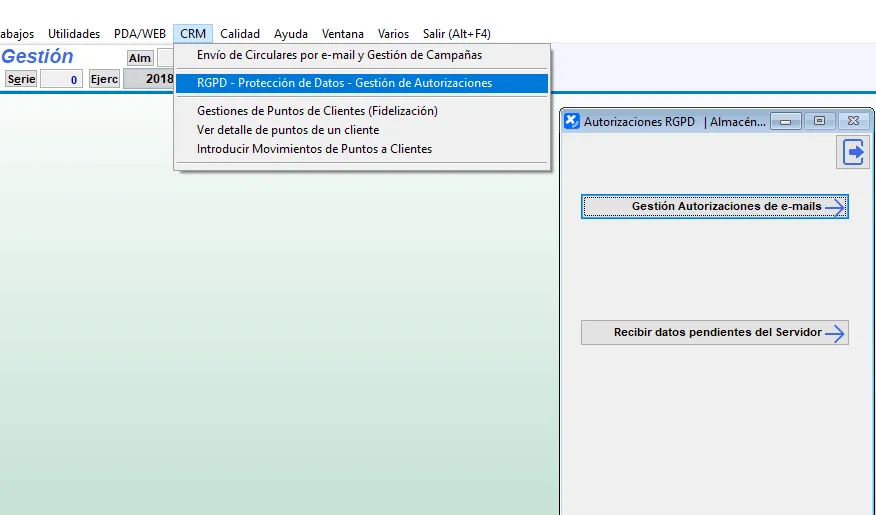 Desde la opción Gestión / CRM / RGPD accedemos al formulario de Gestión de Autorizaciones de RGPD.