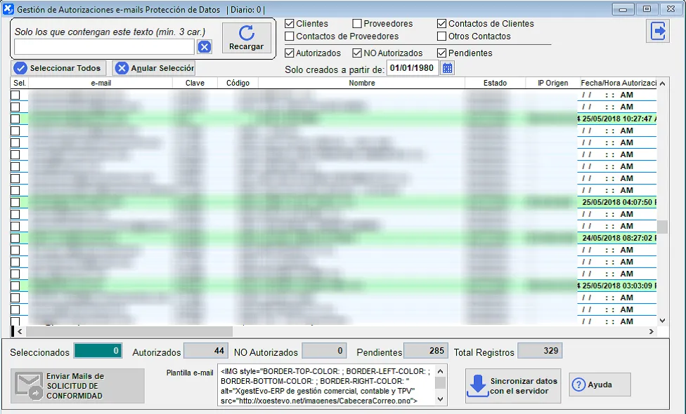 Desde el botón de Recibir datos pendientes del Servidor podemos sincronizar nuestros datos locales con el registro de las conformidades / no conformidades de los e-mails a los que lo hemos solicitado. Esto es imprescindible, ya que se trabaja sobre los datos locales, si hay autorizaciones que no se hayan sincronizado no nos constará hasta que hagamos esta sincronización.