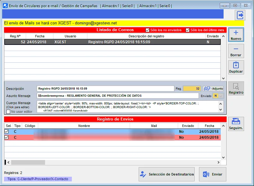 Para facilitar la recogida y gestión de estas autorizaciones, hemos desarrollado un proceso que nos ayuda a enviar e-mails de petición de confirmación de todas las direcciones que tenemos en la aplicación y recoger la autorización o no autorización de cada uno de los destinatarios en un registro que identifica la fecha, hora e IP desde la que se ha ejecutado el proceso de conformar/no conformar el envío.