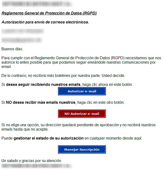 Para cumplir con el nuevo Reglamento General de Protección de Datos (RPGD) en lo relativo a los envíos de e-mails, es necesario que los receptores de dichos e-mails nos autoricen a enviárselos, con en fin de evitar envíos no deseados.