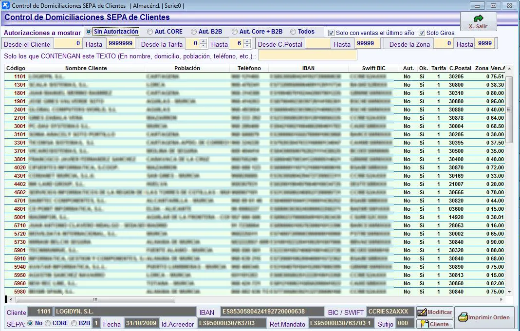 En esta pantalla por defecto nos muestra todos los clientes que tienen una forma de pago marcada como Giro y a los que les hemos vendido algo en el último año (estos filtros y otros se pueden cambiar en los selectores que hay en la parte superior del formulario).