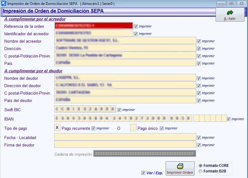Pulsando el botón Imprimir Orden nos imprimirá la orden de domiciliación cumplimentada con todos sus datos (podemos seleccionar si alguno no queremos que se imprima en el selector que tiene cada uno a su derecha).