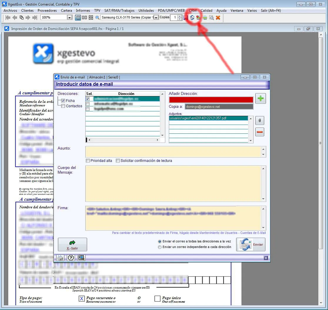 Si marcamos Ver/Exportar nos la mostrará por pantalla, y si tenemos configurada una cuenta de e-mail en Xgest y en la ficha del cliente está su dirección de e-mail, pulsando el botón superior de Enviar Informe por Correo Electrónico que hay en la pantalla de previsualización, podremos enviar el impreso directamente por correo electrónico al cliente (en el ejemplo mostrado a continuación está marcado dicho botón).
