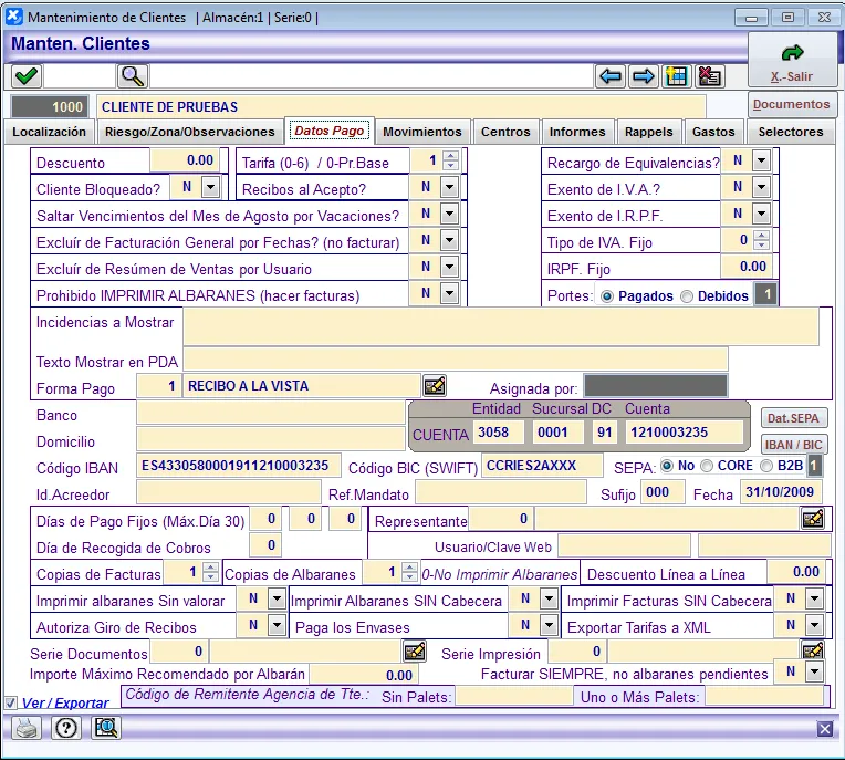 Además, en el formulario de Mantenimiento de Clientes se han añadido varios campos, como el IBAN, el SWIFT y otros campos necesarios para la gestión.