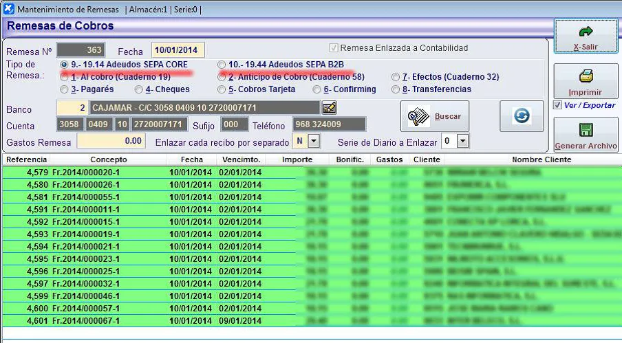 En el formulario de Remesas de Cobros tenemos las nuevas opciones de generar remesas en formatos 19.14 SEPA CORE y 19.44 SEPA B2B.