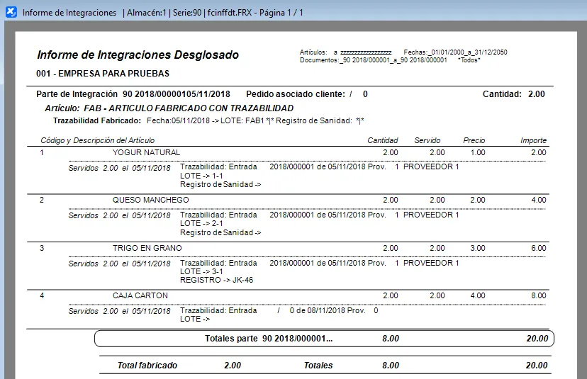 En las siguientes capturas podemos ver un ejemplo del listado y otro ejemplo del Informe de Integración de una partida de una integración/fabricación.