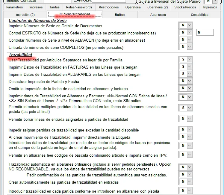 El parámetro principal es el de Usar Trazabilidad por Artículos Separados en lugar de por Familias, por defecto configurado a “S” que es lo más habitual (la trazabilidad así se controla producto a producto, si ponemos una “N” se controlará por familia, es decir, podemos dar entradas de lotes en un producto y las salidas en otros productos de la misma familia, se usa por ejemplo para canales de carne, entra un canal y salen distintos productos del despiece).