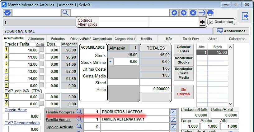 En la tabla de artículos configuraremos en familia de compras la familia a que corresponde, y en base a ello, si dicha familia está marcada como que está sujeta a trazabilidad automáticamente nos pedirá el alta de lotes al dar las entradas y la asignación de lotes en las líneas de albaranes de ventas.