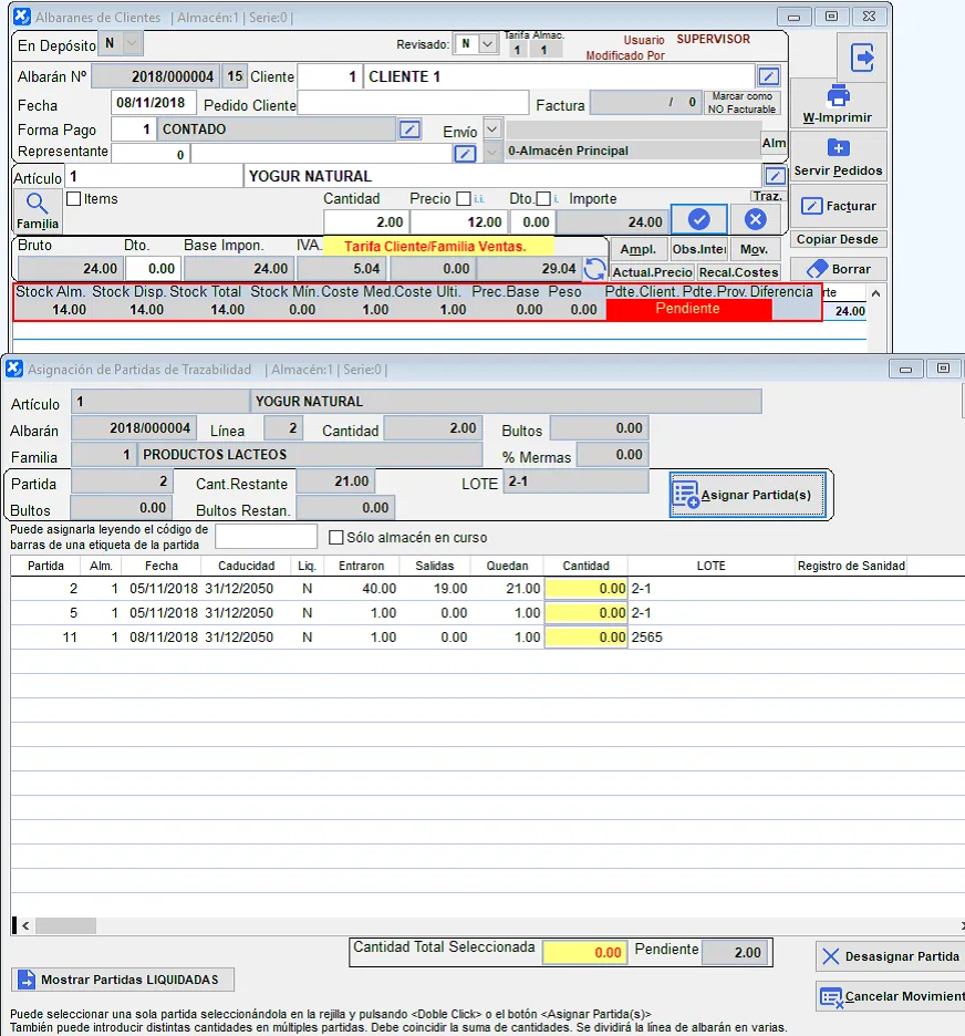 Al crear los albaranes de venta a clientes, cuando introduzcamos una línea de producto sujeto a trazabilidad automáticamente nos mostrará la pantalla de asignación de partidas de trazabilidad con todas las partidas que aún no están liquidadas para que le asignemos a qué partida o partidas corresponde el material que servimos seleccionando la partida o poniendo la cantidad de cada partida que servimos en la casilla correspondiente y pulsando Asignar Partida(s). Si corresponde a más de una partida dividirá la línea del albarán en varias líneas, una por cada partida con su cantidad.