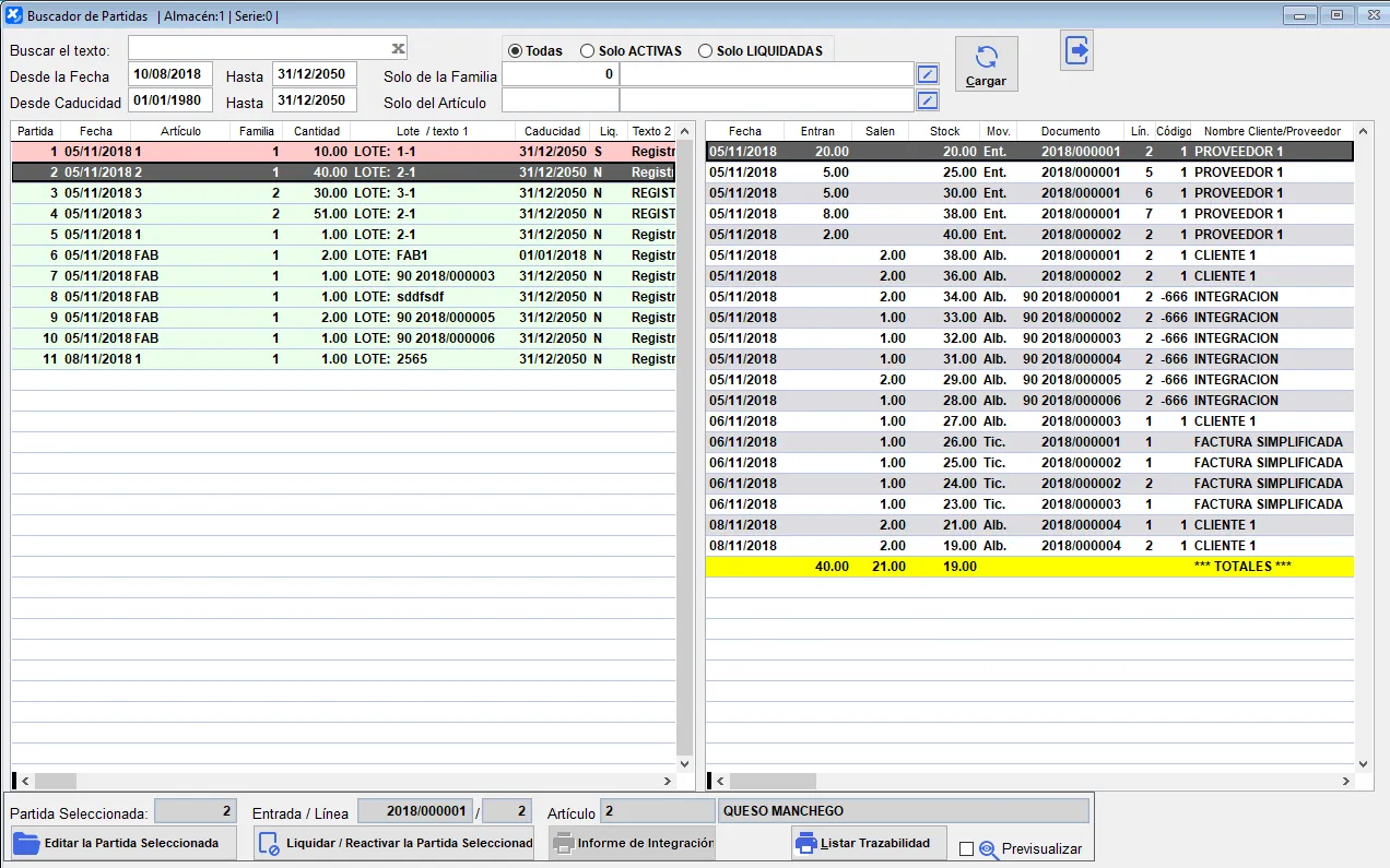 En la parte inferior tenemos los botones para editar la partida seleccionada, liquidarla o reactivarla, acceder al informe de integración/fabricación si esa partida es de un producto fabricado (accede a la pantalla para listarlo con la partida preseleccionada) y el botón Listar Trazabilidad que nos emite un listado de todas las partidas mostradas en la rejilla de la izquierda con todos sus desgloses de movimientos de entradas, salidas y la composición de su stock restante, con el detalle de a quién se ha comprado y vendido cada movimiento, su fecha y su tipo.